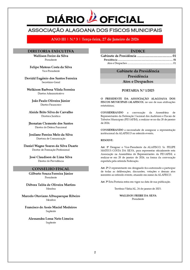 PUBLICAÇÃO DA PORTARIA Nº 02/2025 INDICAÇÃO DO VICE-PRESIDENTE PARA REPRESENTAR A ALAFISCO DA ASSEMBLEIA A SER REALIZADA PELA FENAFIM.11 de dezembro de 2025